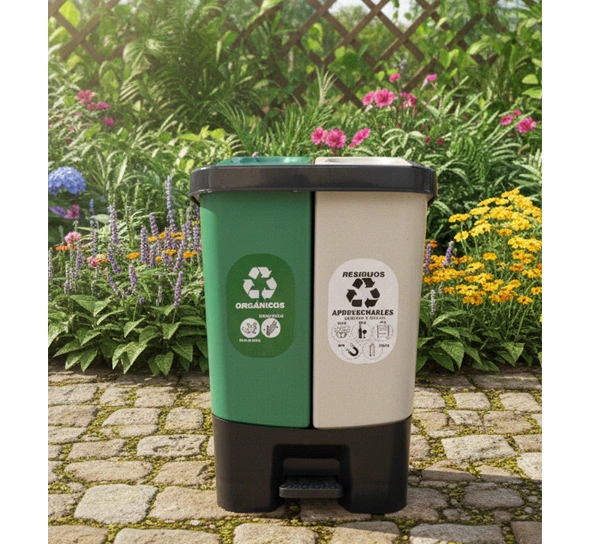 Cuenta con un sistema de pedal, de fácil mecanismo, dos contenedores por separado con manija que a su vez sirve como pisa bolsa.